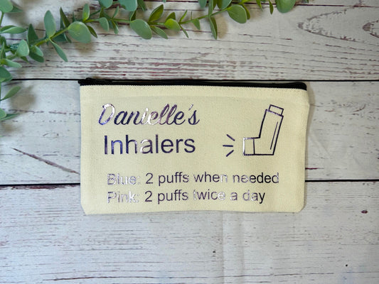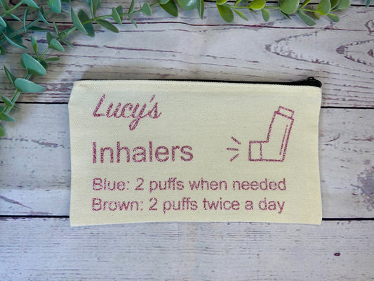 Personalised Cotton Canvas Inhaler Bag With Directions | Glitter Vinyl | Cotton | Inhaler Pouch | Medication Bag